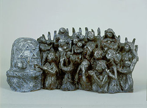 ![]() The Last Sabbath Though we hear them at the door It is the Sabbath. Time to light our candles and pray, Time for women to teach the young, Time to pass the heritage to the children. This sculpture depicts the last Sabbath celebrated by the Jewish women and children before they were captured and executed. Description: Terra Cotta Ht. 7" L. 7" W. 14" Wt. 4.5 lbs. |