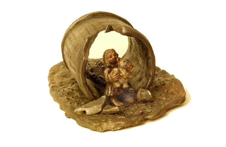 ![]() Star Is she hiding in the large barrel (or pipeline), or just passing through? One shoe is on, one shoe is lost. The child stands alone in the cold running water, comforted only by a toy stuffed animal. In an act of innocence she has removed the yellow star sewn onto her coat by her mother, and pinned it to the chest of her bear. Description: