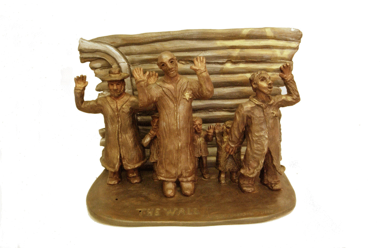 ![]() Wall We do not see soldiers pointing weapons, but we know they are there. The Jewish men, standing outside a Jewish building, try to shield their children. Behind them is the partial outline of a door. We do not know if it is a real door, or a spiritual door. We do not know if the people have just exited, or are about to enter. We only know that the doorway is shaped like the right side of the Hebrew letter Chet, used in the word "Chai" (meaning "Life"). Perhaps the doorway is in the shape of a Shofar, calling them "home" to God. We believe the essence of their souls will continue. Description: